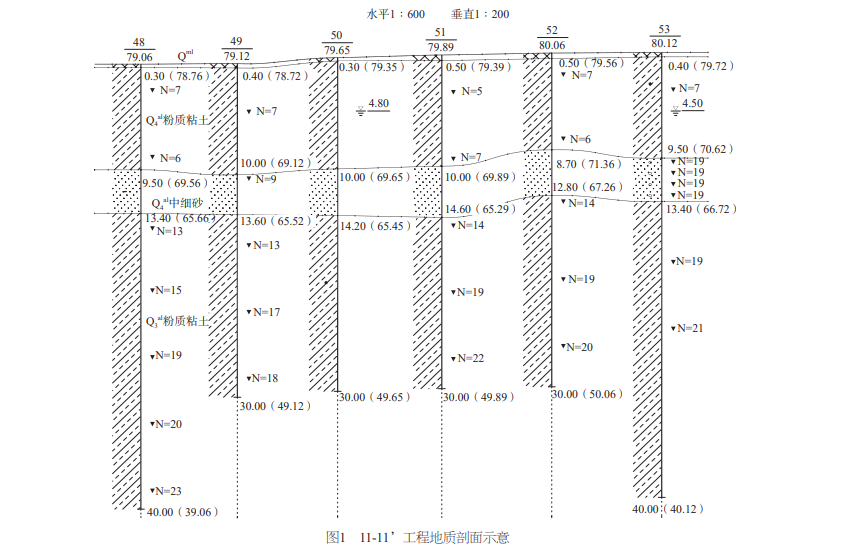 根據(jù)勘察報(bào)告,該區(qū)域以粉質(zhì)粘土為主,地下水位約為自然地面下5m,自然地面以下約10~14m存在4m厚中細(xì)砂層且分布不均勻(圖1),此為典型液化地層;根據(jù)該地質(zhì)情況設(shè)計(jì)采用鋼筋混凝土樁。